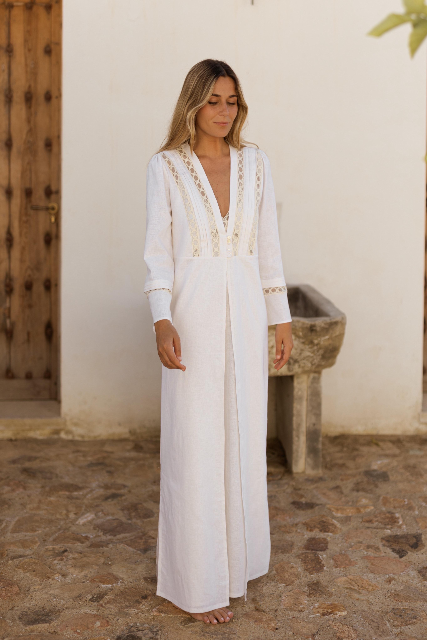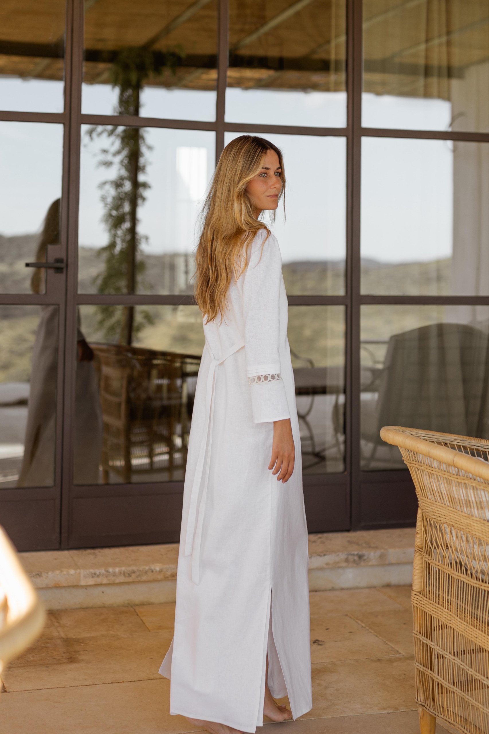 La bata de novia Héritage —herencia, en francés— está inspirada en las batas antiguas de nuestras abuelas, reinterpretada con un aire actual y elegante. Confeccionada en lino suave y decorada con el mismo encaje de tul delicado que el camisón Éloïse. Incorpora jaretas en el pecho y las mangas. Un trabajo delicado que resalta el carácter artesanal de esta pieza convirtiéndola en una prenda versátil. Ideal para estar en casa sin renunciar al lujo silencioso que define esta colección.