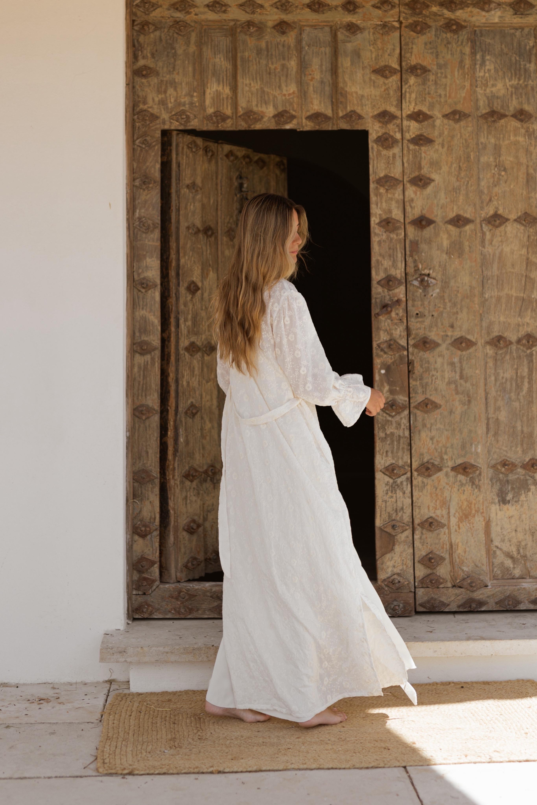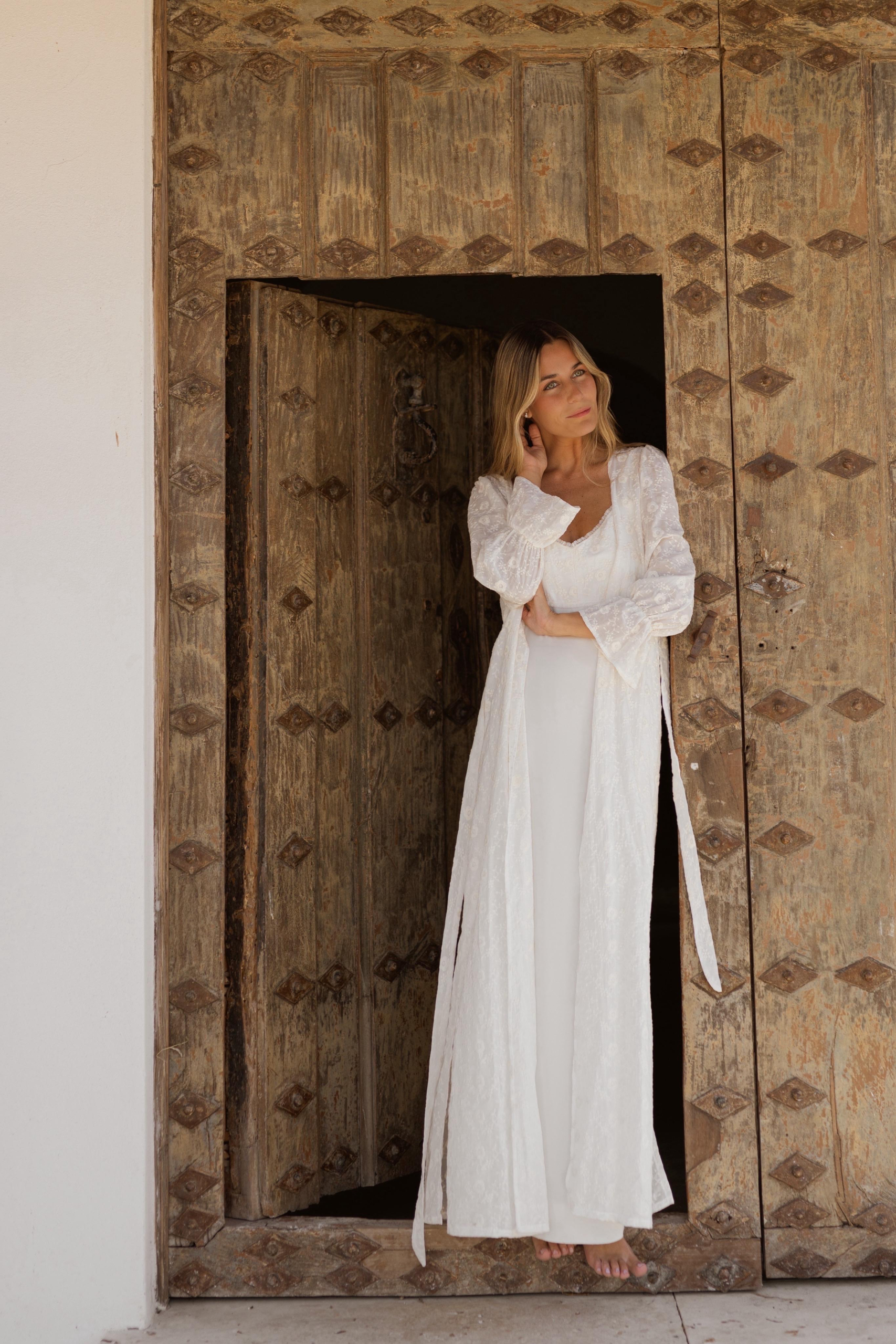 Confeccionada en seda bordada , es un tejido completamente natural, que evoca la naturaleza y los despertares tranquilos. Su silueta sencilla y su ligereza extrema hacen de esta bata una declaración de estilo íntimo. Es nuestra bata de novia por excelencia, la joya de Binac Nuit.