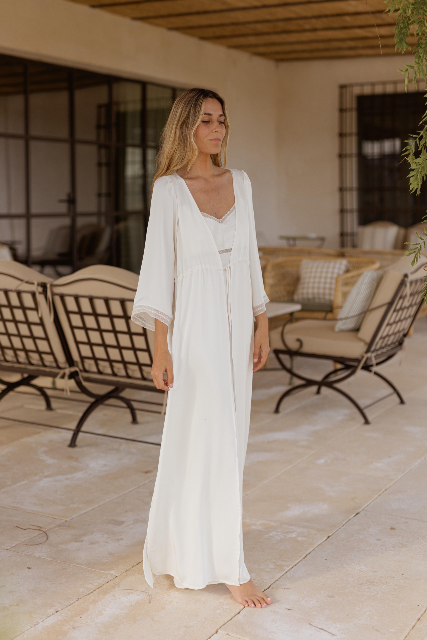 Este camisón de novia se completa con la bata Margot, que comparte tejido y encajes, creando un estilo de novia elegante y sofisticada.