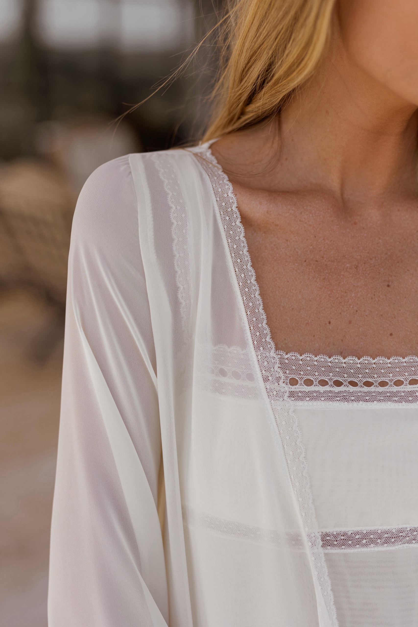 El camisón Flavie es una joya inspirada en los antiguos camisones antiguos. Confeccionado con capas de gasa y encaje Valencié. Lleva un pasacintas que permite añadir, si se desea, una cinta de terciopelo en tono gris verdoso . Tirantas en gasa y encaje. Un camisón de novia diferente, para bodas especiales. Combínalo con la bata Biarritz para un look de boda.