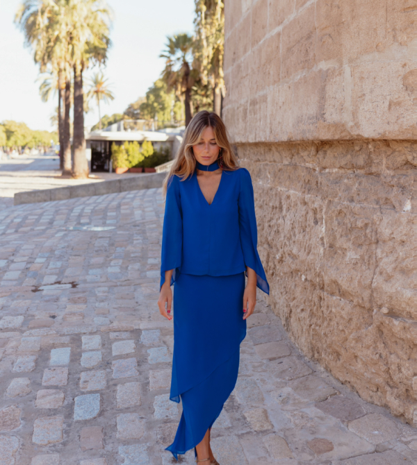 La falda asimétrica, ajustable con dos lazadas y un volante en uno de los lados, ofrece una caída suave y vaporosa, aportando movimiento en cada paso