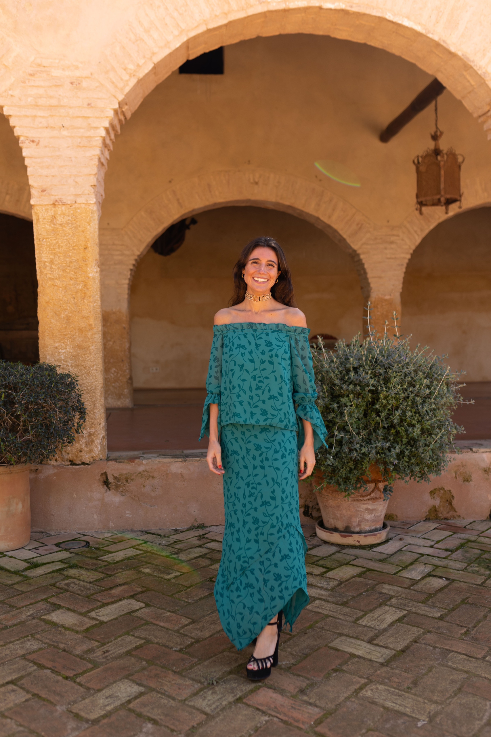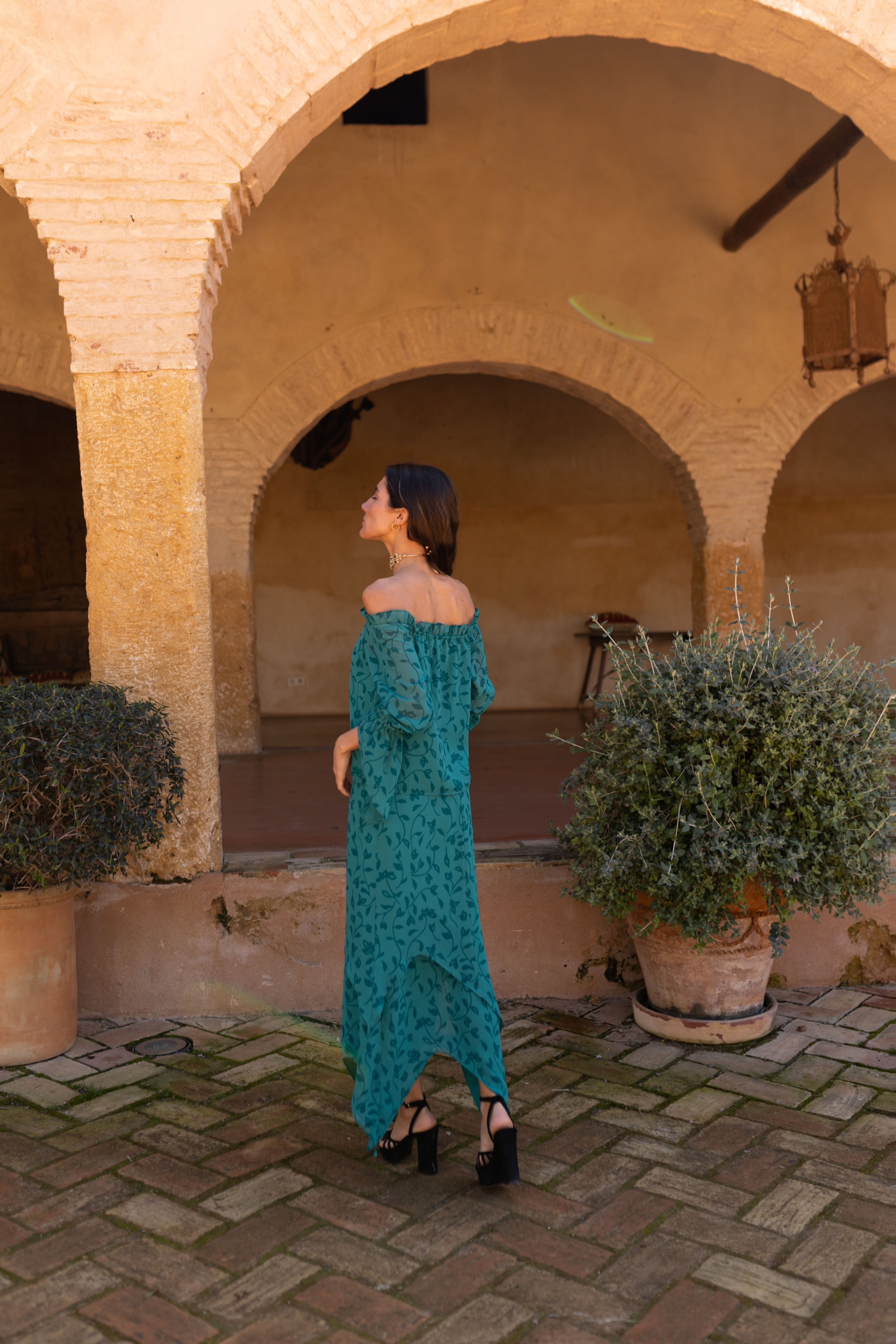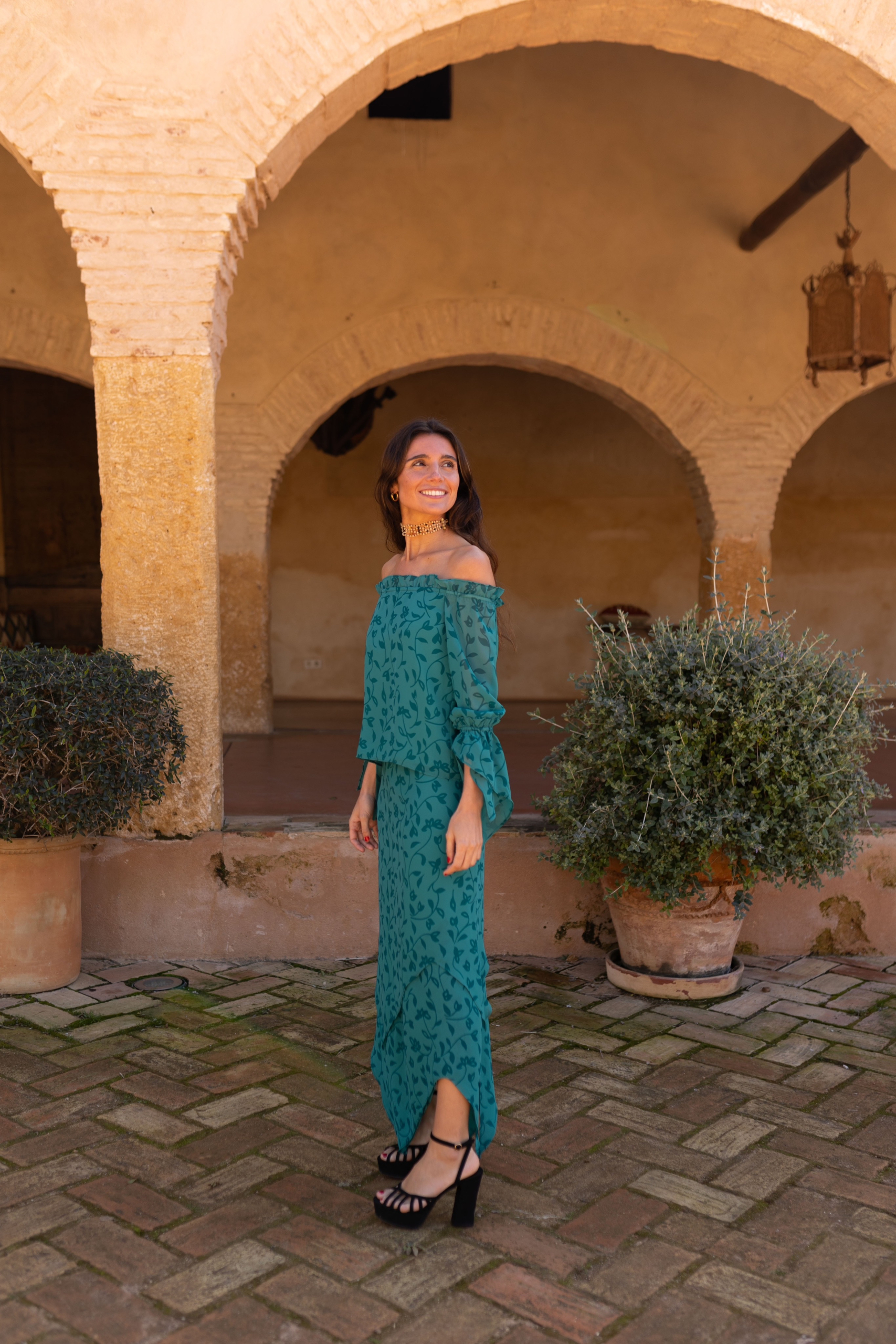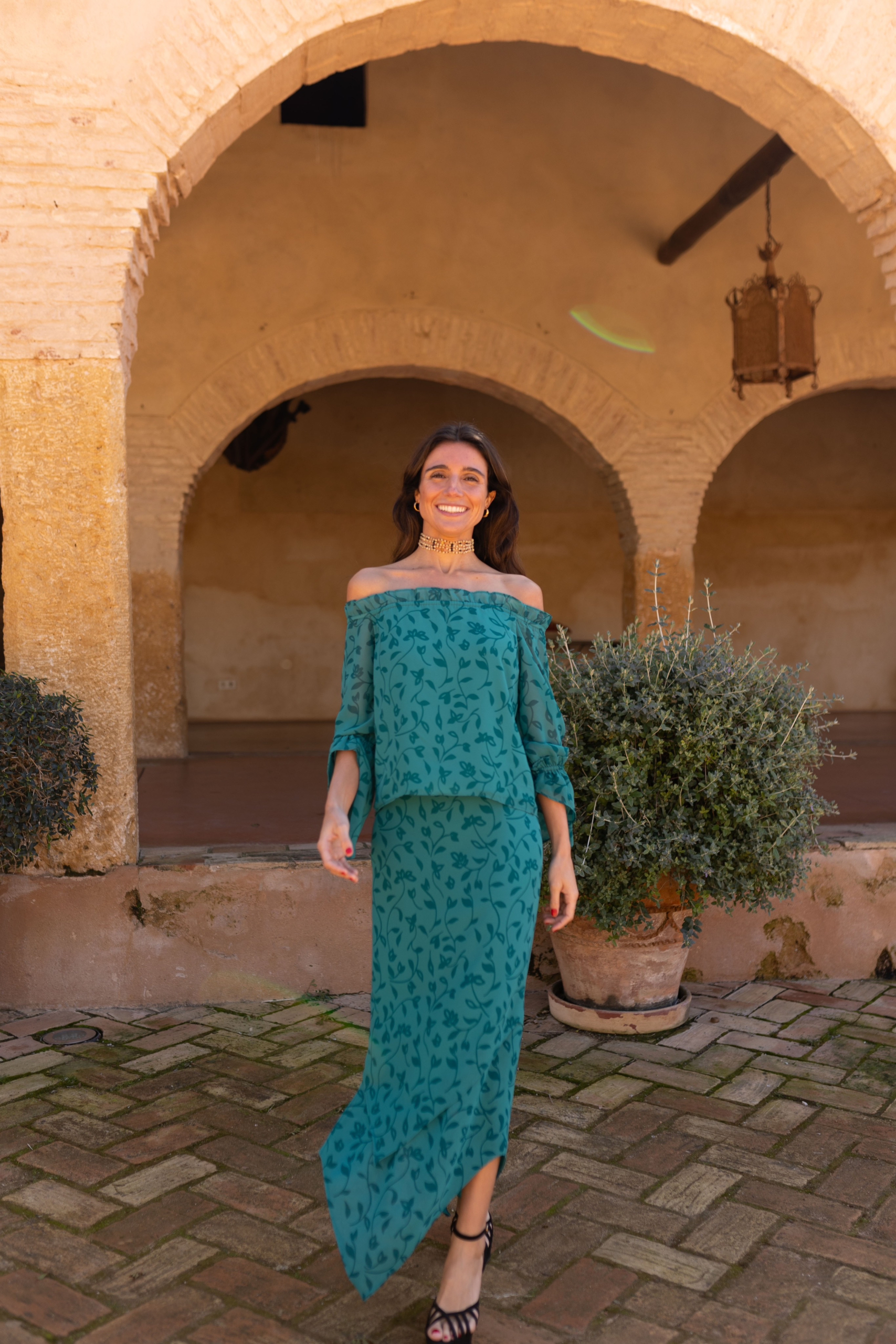 Total look confeccionado en gasa estampada con flores en tonos azulones. Escote estilo Bardot.