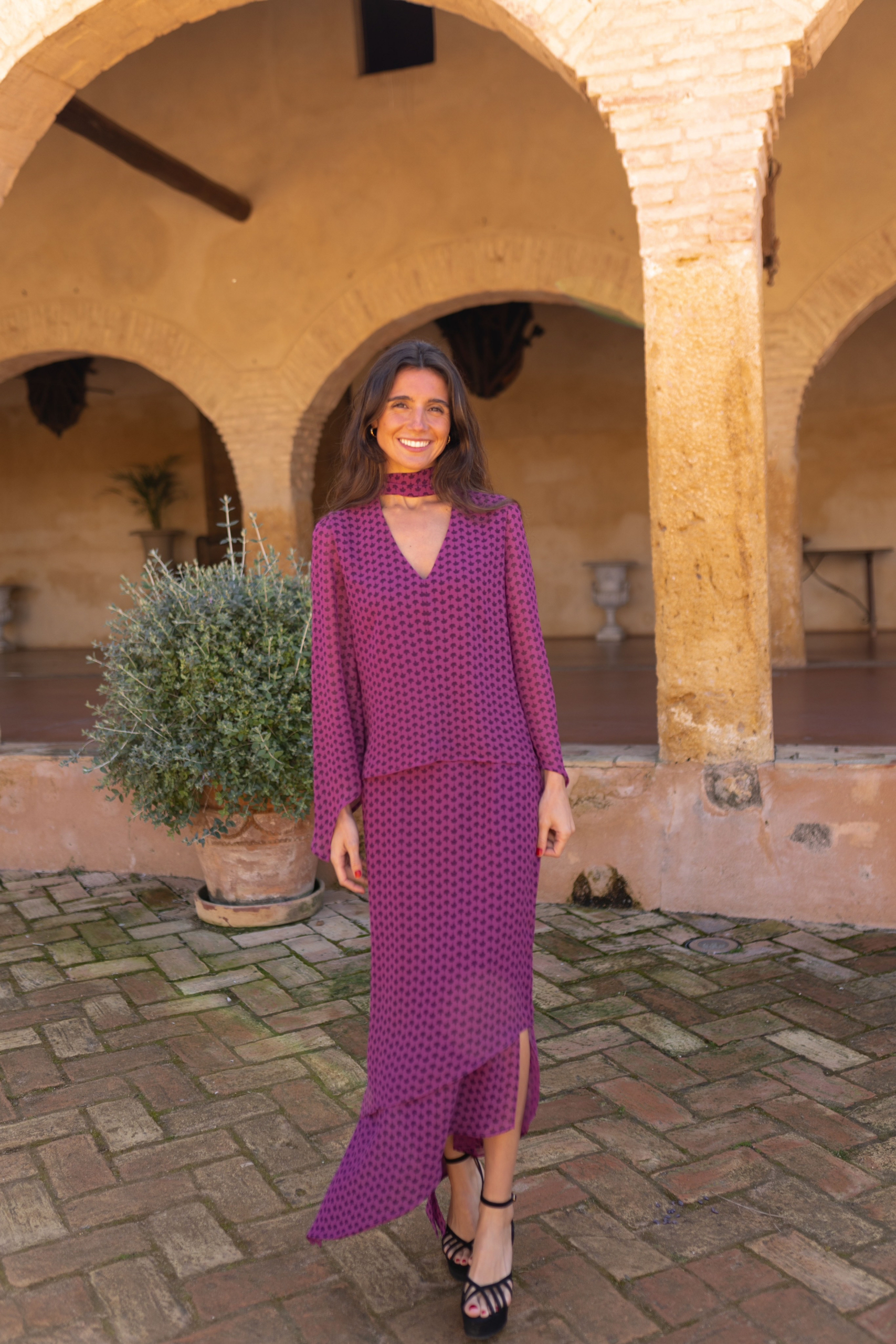 Total look confeccionado en gasa estampada con flores en tonos morados. El top tiene una lazada para rodear el cuello o dejarla suelta según se prefiera. La falda tiene dos capas con corte asimétrico y se cierra con cremallera trasera. Falda con caída suave y vaporosa.