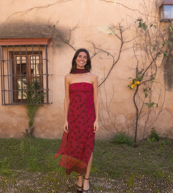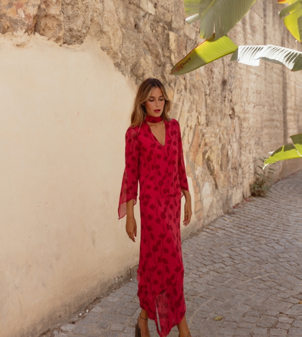 Este conjunto de gasa estampada de flores en tonos berenjena y fresón combina a la perfección estilo y comodidad. El top cuenta con un nudo en el escote y cierre de botón en la espalda, mientras que la falda asimétrica, ajustable con dos lazadas, tiene una caída suave y vaporosa que aporta movimiento en cada paso.