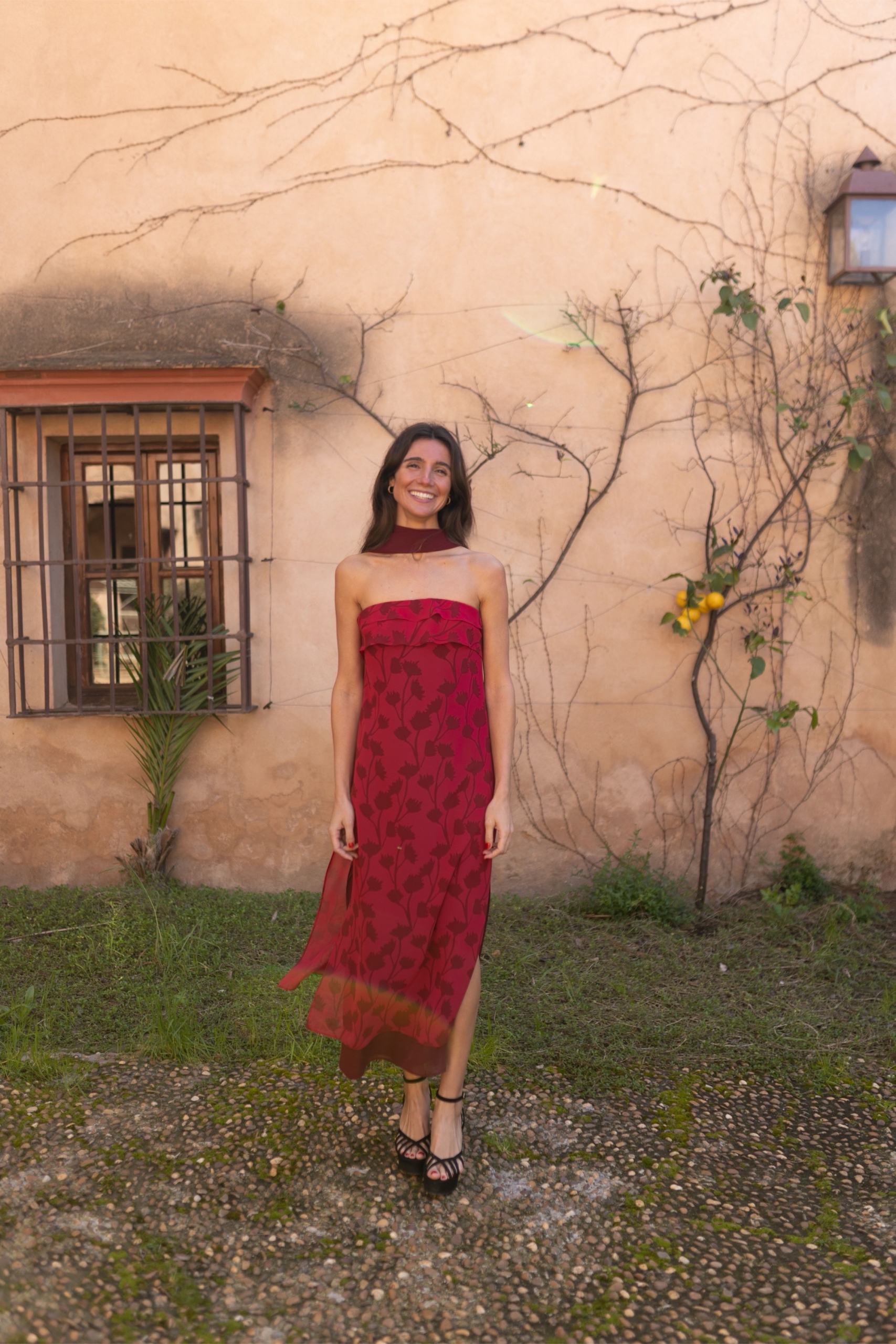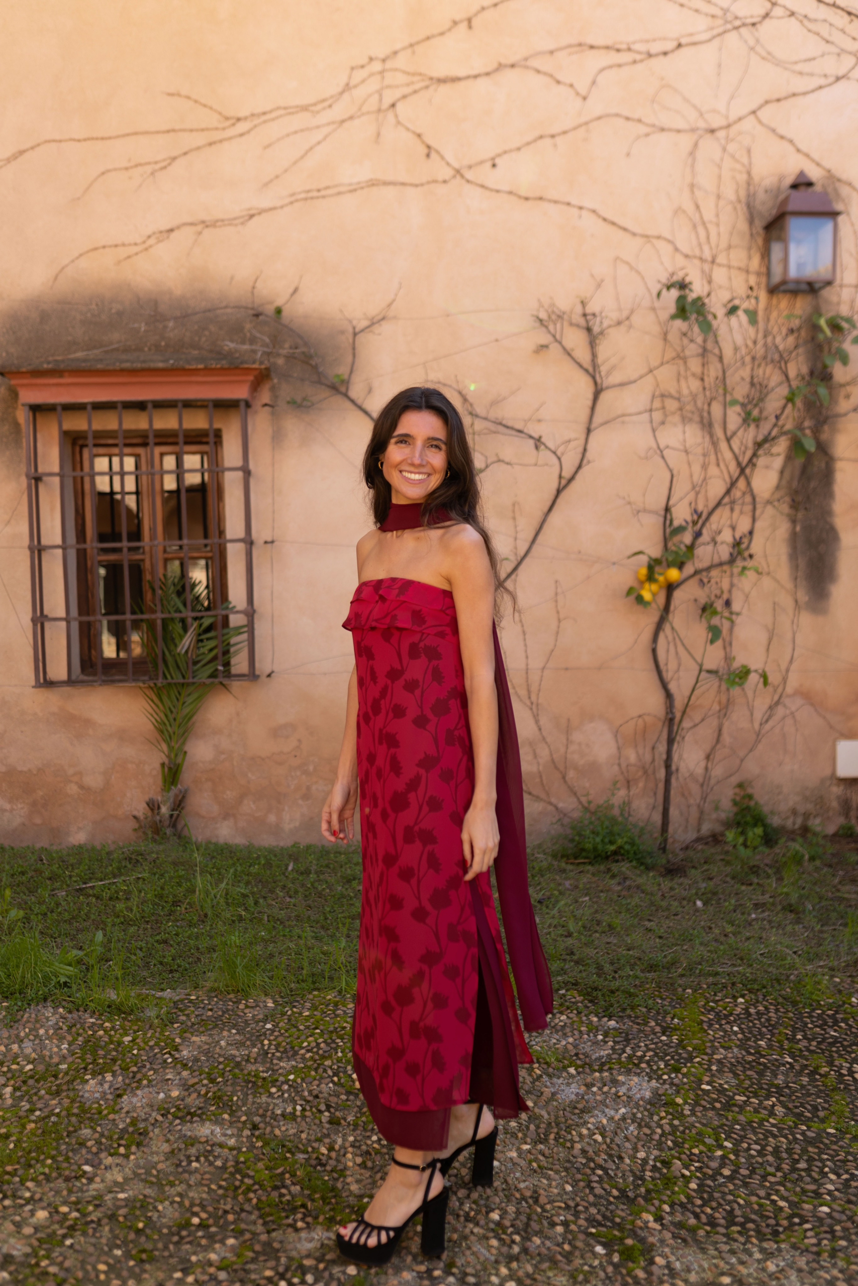 El vestido viene con una cinturilla para realzar la cintura o usarla como choker, según se prefiera. Además, incluye un chal en color burdeos.
