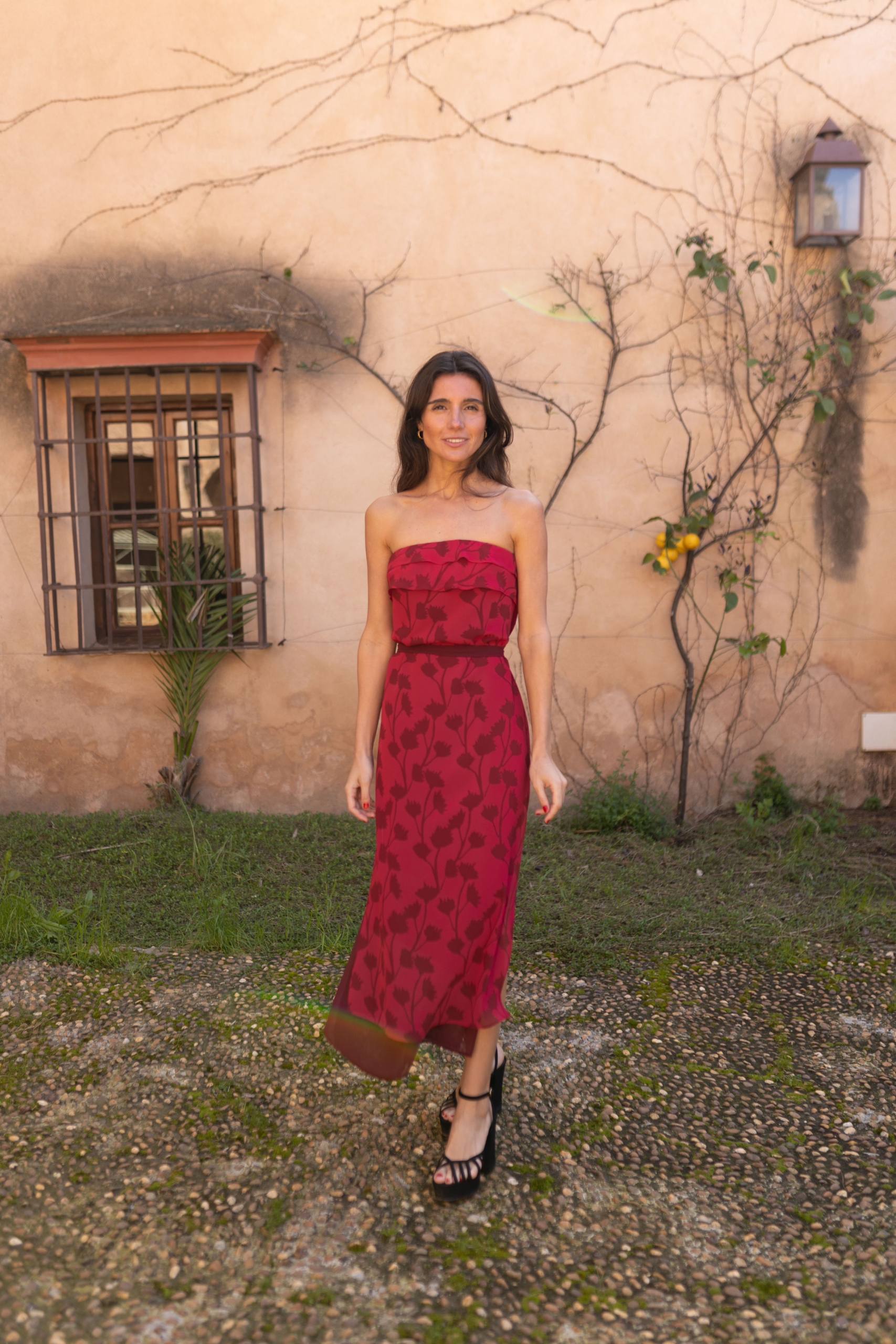 Vestido confeccionado en gasa estampada con flores en tonos fresón y burdeos.
